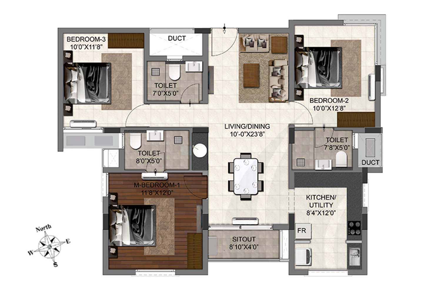 - Area will all have high-quality 2'0" x 2'0" vitrified flooring with 4" skirting.