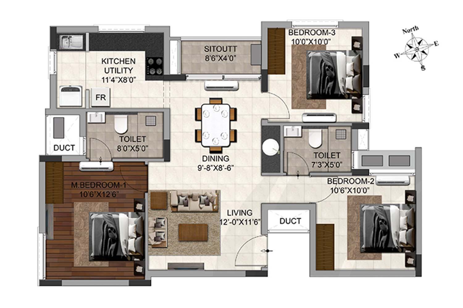 - The dining area, bedrooms, and living room are fan points.